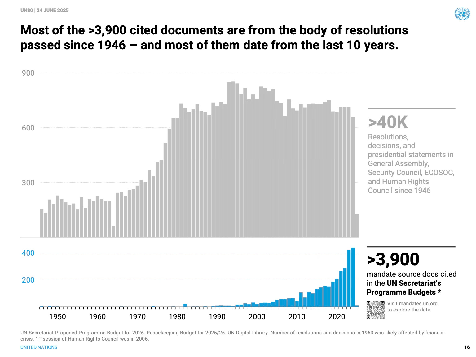 During his 24 June briefing to Member States on the UN80 initiative, UN Under-Secretary-General for Policy Guy Ryder demoed an impressive-looking mandate registry as the centerpiece of his presentation on progress in the second workstream of the UN80 initiative, the mandate review. Although the mandate registry provides a potentially useful reference tool, its practical value to the broader UN80 initiative remains unclear. In fact, this is a problem with the entire mandate review workstream—the likelihood that it will yield useful insights to inform reform-related decision-making is extremely slim.1 As indicated by the Secretary-General on 12 May, the objective of the mandate review is to identify “duplications, redundancies, or opportunities for greater synergy on implementation”. This exercise, however, is built on a flawed premise, as mandates are not the cause of duplication, redundancy, and inefficiency within the UN. The inflated expectations from the mandate review by its proponents stem from a fundamental misunderstanding of the nature of mandates at the United Nations.